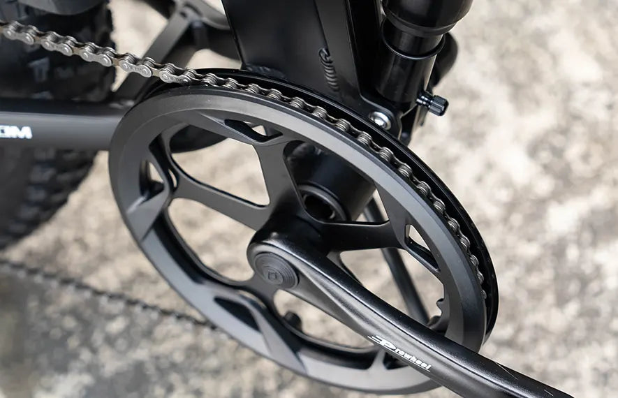 The large chainring delivers impressive power, enabling faster riding with reduced unnecessary pedaling. Additionally, the double chain cover ensures that the chain remains securely in place, preventing any easy derailment.