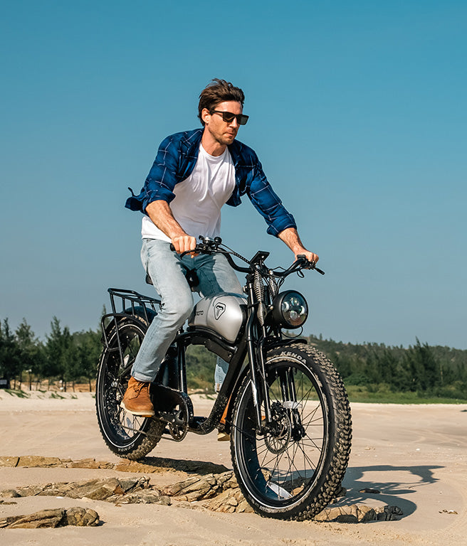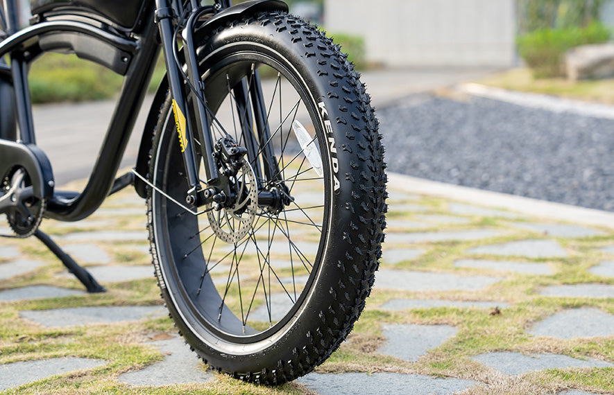 The 26"*4.0 tires provide exceptional traction suitable for various terrains, including sand and asphalt.